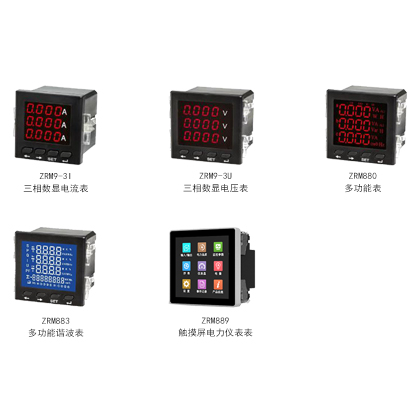 ZRM9系列数显电测表适用于电力电网自动化控制系统中对电流、电压等电参量的测量和显示,具有变比可设、显示直观、精度高、稳定性好、隔离性强、抗震动等优点。可选配多种扩展功能,包括RS485通讯、越限报警和模拟量变送输出等。