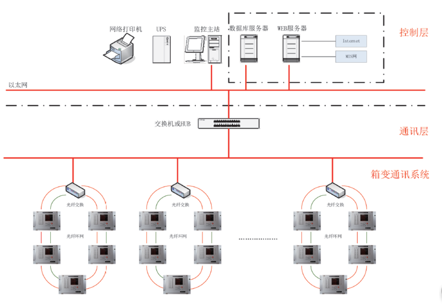 ZRR-9002风力/光伏发电厂监控系统由安装于每台箱变内的箱变测控装置、箱变监控后台、自愈式光纤以太网交换机以及光纤连接设备及附件等组成。其中箱变监控后台可与升压站监控系统集成,由升压站监控系统组态。箱变测控单元通过自愈式光纤以太网环网与升压站内监控后台进行通信,实现数据交换,完成对箱变的控制和数据采集。自愈式光纤以太网交换机的数量根据风场/光伏箱变监控装置所组成的光纤环网数量而定。